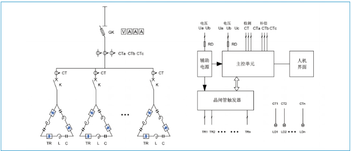 華天HTEQ系列動態消諧無功補償裝置由檢測單元、主控單元,投切執行單元和調諧電容器組(含電抗器)、人機界面等部分構成。檢測單元通過電壓、電流傳感器實時檢測系統電壓和電流的瞬時值,并實時計算出系統所需無功功率功率、諧波成分、電壓電流有效值等控制參量,由主控單元完成邏輯判斷并發出相應的控制指令,控制投切執行單元投切調諧電容器組,實現對負載無功功率的動態跟蹤補償。
