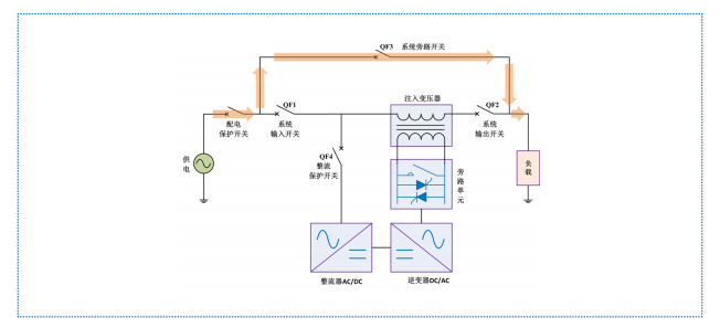 HTAVC 在自身設備發生故障時會自動轉為內部旁路供電,旁路快速響應由晶閘管切換完成,旁 路保持由機械觸點完成。此時,逆變器不生成補償電壓,市電通過注入變壓器主回路側繞組直接為負載供電。