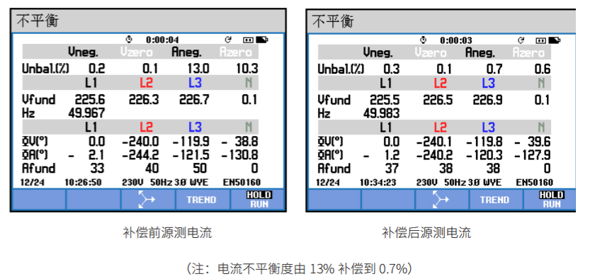 配電臺區(qū)統(tǒng)一電能質(zhì)量調(diào)節(jié)器能夠快速的補(bǔ)償由于負(fù)載不平衡所產(chǎn)生的負(fù)序電流,始終保證流入電網(wǎng)的三相電流平衡。