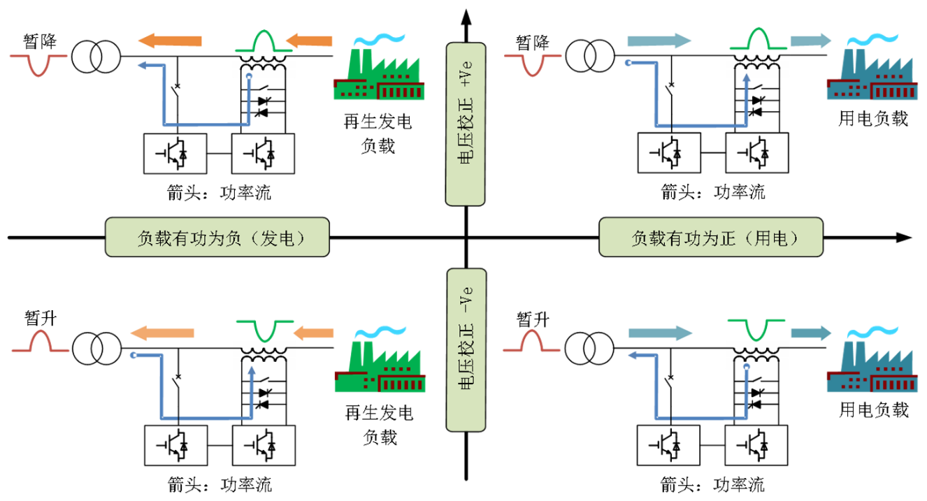 當(dāng)負(fù)載為發(fā)電狀態(tài)(有功功率為負(fù))時(shí),電源側(cè)電壓發(fā)生突降,串聯(lián)功率單元從注入變壓器獲取能量,并聯(lián)功率單元將能量回饋到電網(wǎng)中,以補(bǔ)償電壓的突降。
